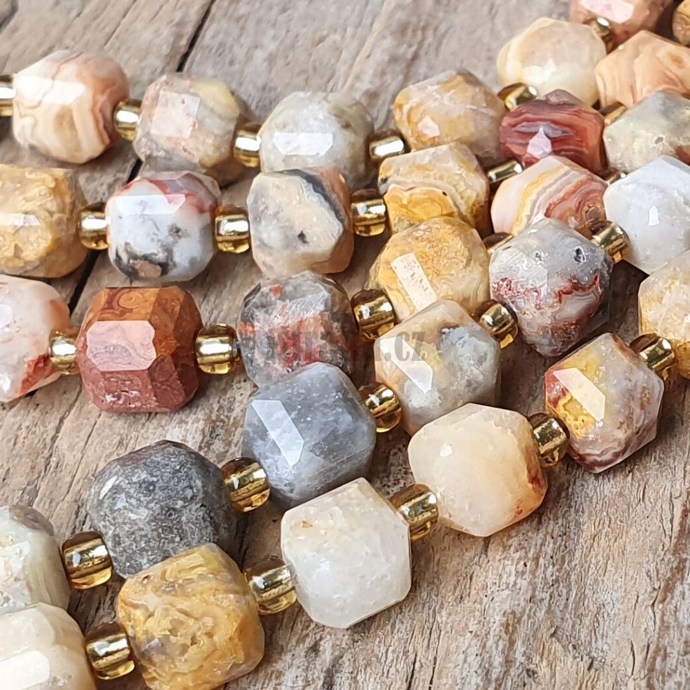 - Achát crazy lace korálky 6mm kostky broušené půlšňůra