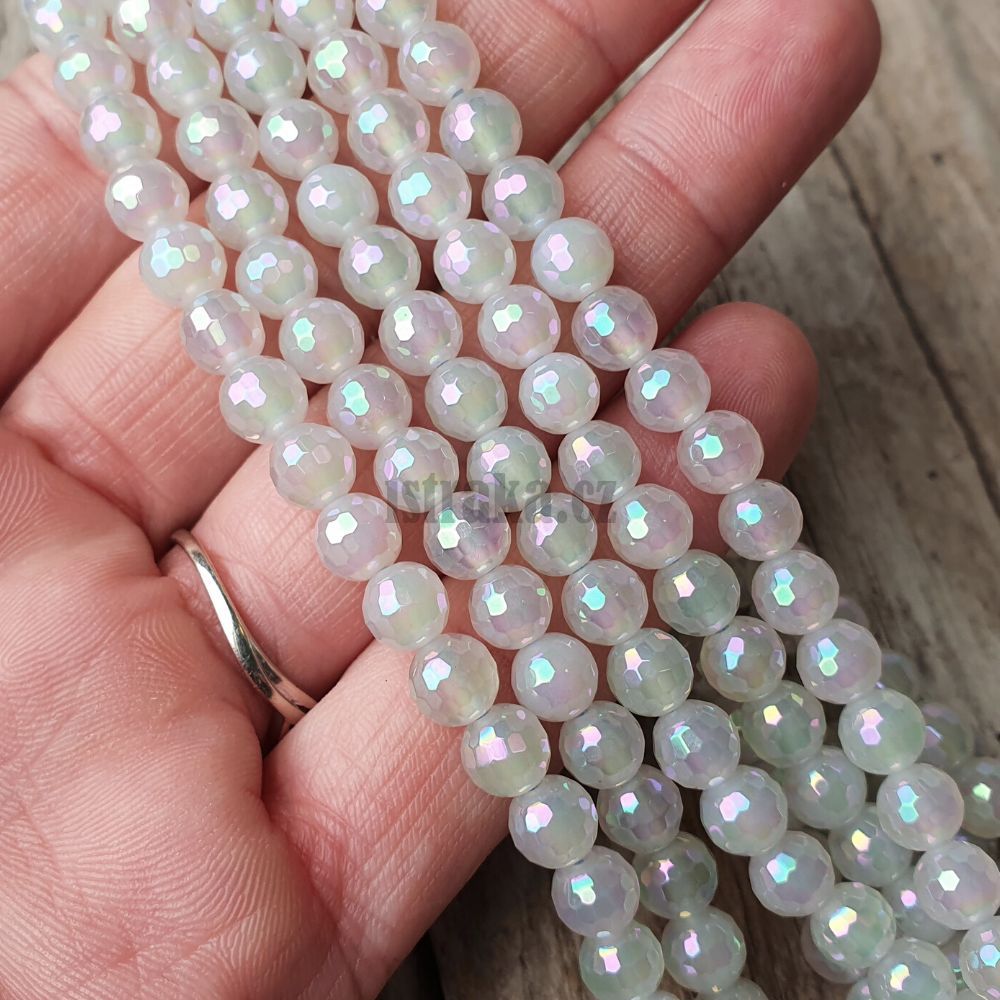 - Achát korálky 6mm broušené bílé s duhovým pokovem šňůra