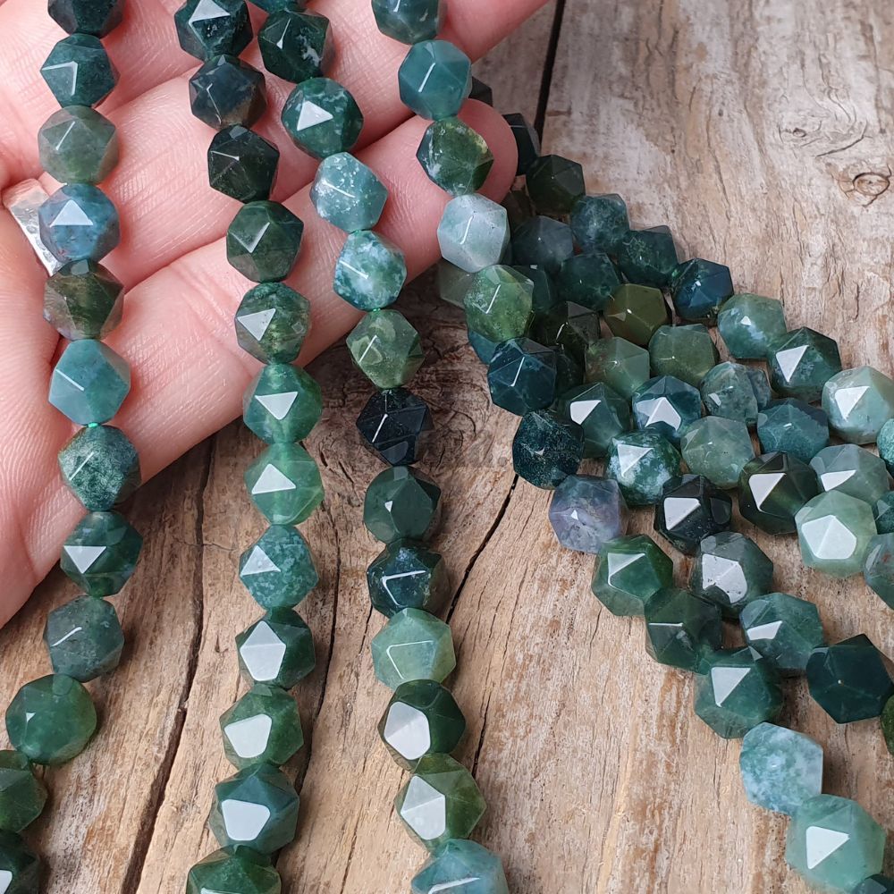 - Achát mechový korálky 8mm bicone výbrus šňůra