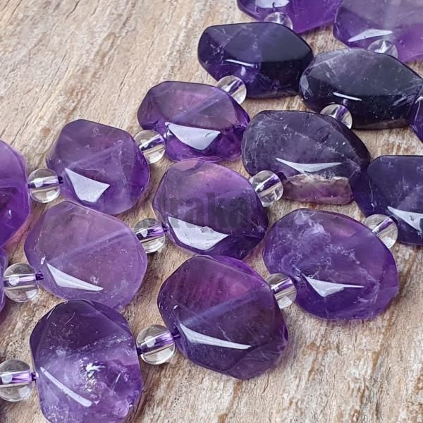 Zajímavé korálky z přírodního minerálu ametyst s točeným - twist výbrusem s leklým povrchem.