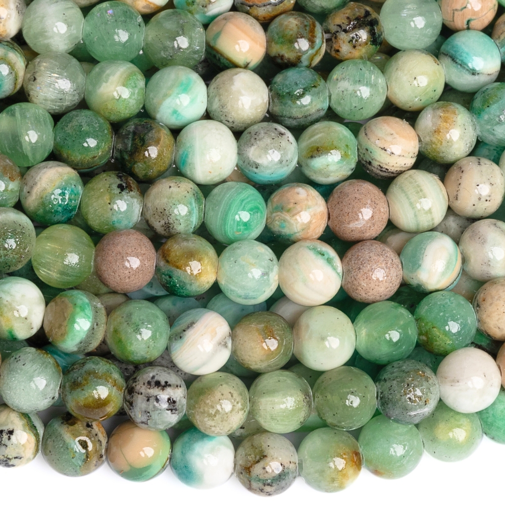 Přírodní jadeit v zeleném barevném mixu, broušený do kulatých korálků o průměru 6 mm, navlečených na šňůře.