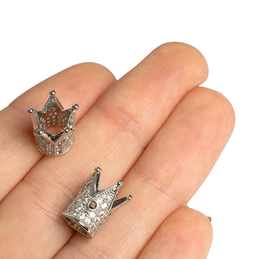 Podlouhlá kovová korunka vykládaná kubickými zirkony. Samotné korunky jsou velmi pěkné a krystalky precizně vsazené. Stačí mít jednu takovou ozdobnou korunku a váš náramek se hned krásně rozzáří :) Nejvíce se korunky hodí k 8mm a 10mm korálkům.
