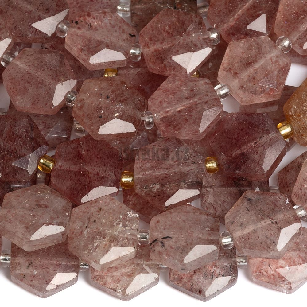 - Křemen jahodový korálky 12mm hexagony broušené půlšňůra