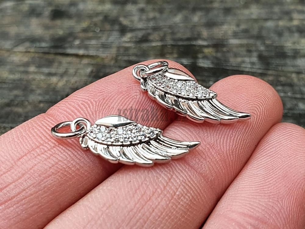 Přívěsek křídlo ze stříbrné slitiny kovů s bílými kubickými zirkony o velikosti 19x7 mm.