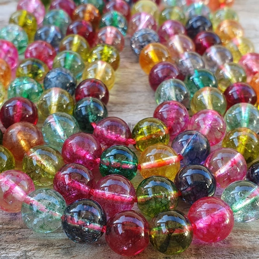 Praskaný křišťál je synteticky vytvořený minerál s popraskanou povrchovou úpravou, která časem může vymizet. Tato úprava zároveň zvyšuje křehkost korálků, proto nedoporučujeme vyrábět z nich náramky na dětské ručky.