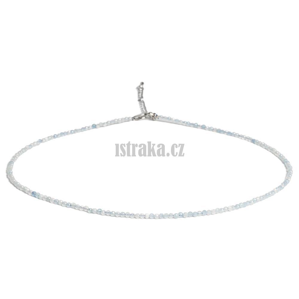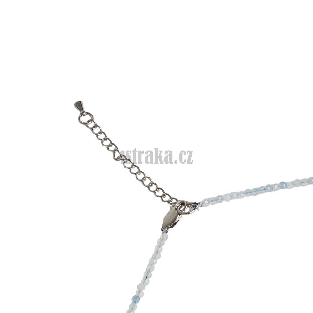 Jemný elegantní náhrdelník z minerálu akvamarín. Náhrdelník je tvořen broušenými malinkými korálky a je ukončen karabinkou a prodlužovacím řetízkem dlouhým cca 7 cm, takže si můžete regulovat jeho délku.