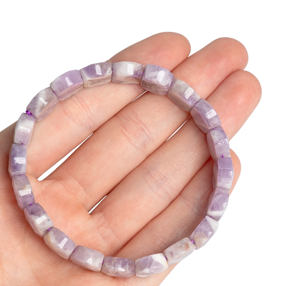 Elegantní náramek z přírodního minerálu ametyst tvořený oblými zploštělými korálky - rondelkami v nádherných odstínech fialové barvy. Náramek je elastický a pro pohodlné nošení vhodný na zápěstí s obvodem maximálně 17 cm.