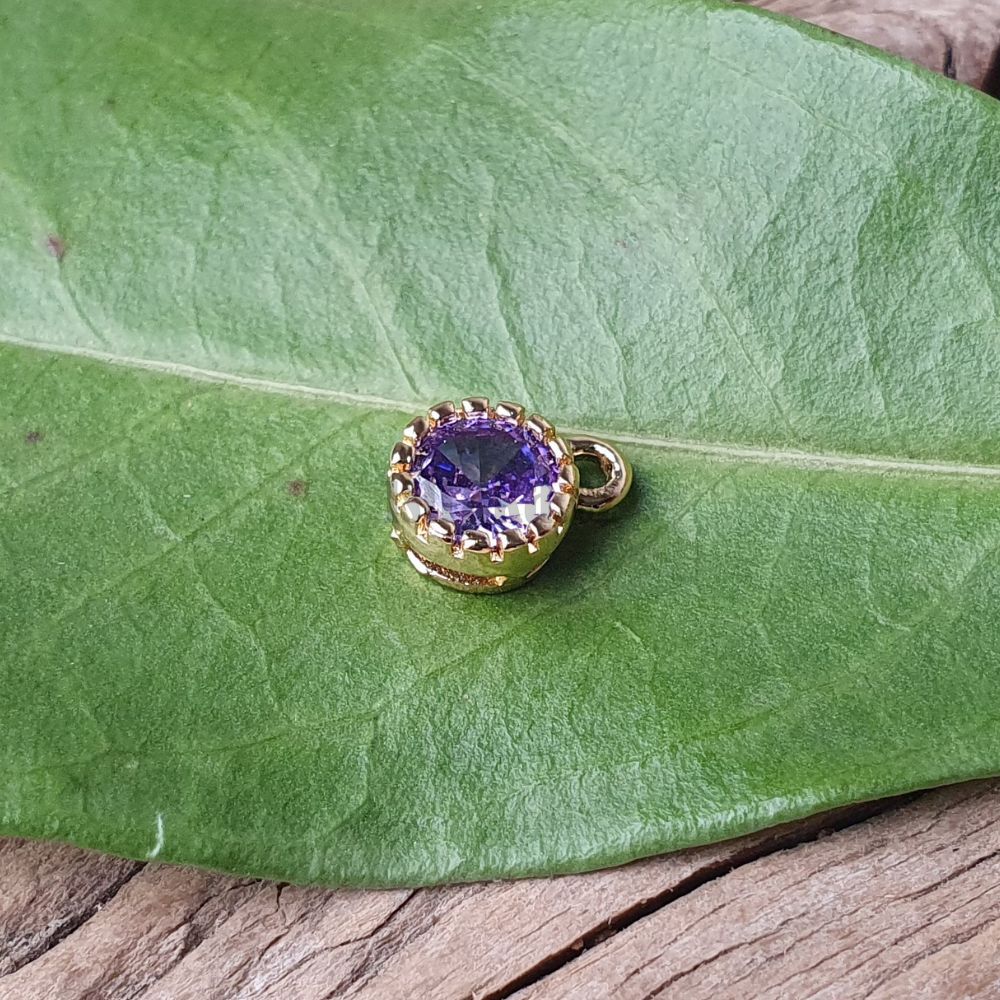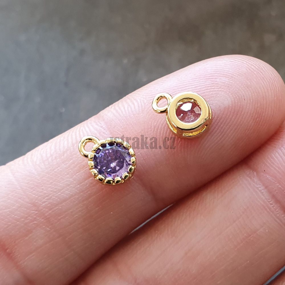 Minipřívěsek zlaté barvy s fialovým zirkonem - kulatá placka. Ideálně se hodí k doplnění náramku z menších korálků či k výrobě něžných náušniček.