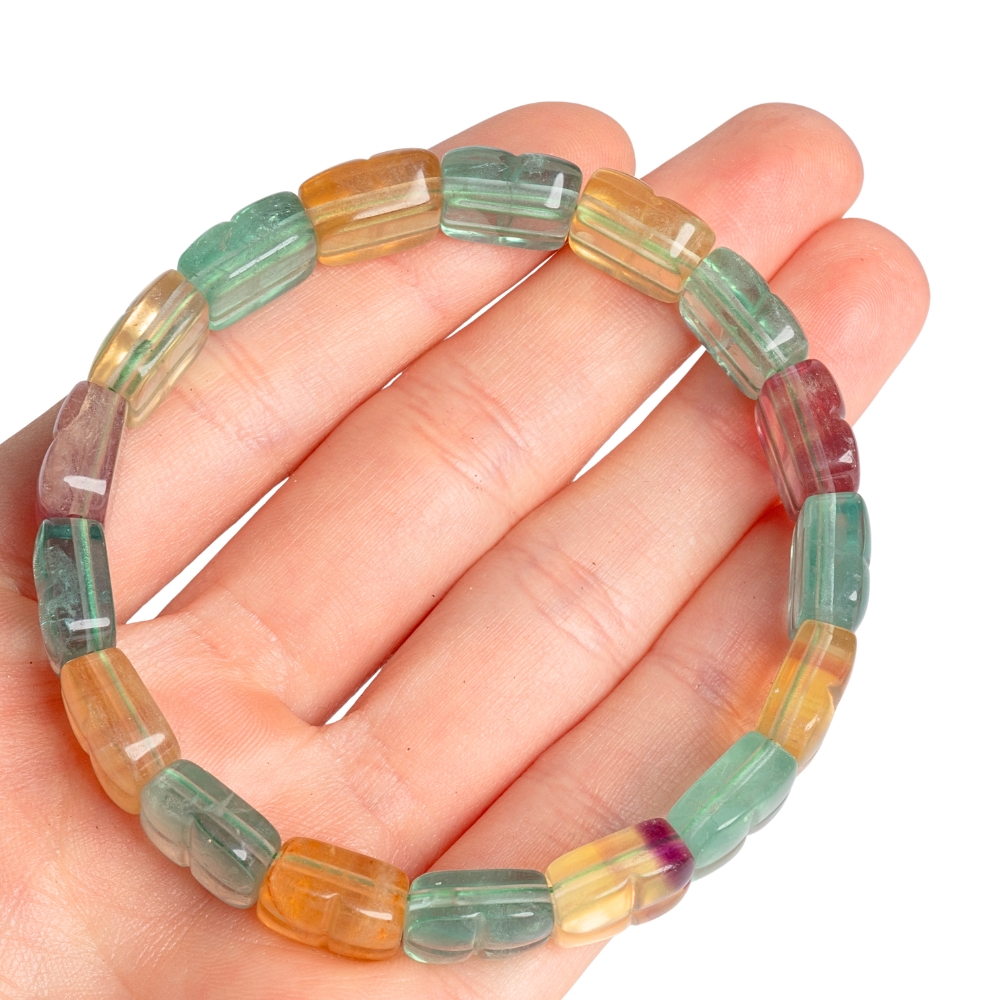 Elastický lesklý náramek z přírodního minerálu fluorit tvořený nepravidelnými nugetkami navlečenými na vícevláknové gumičce.