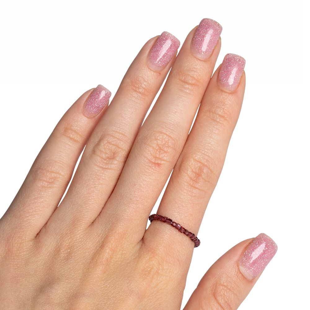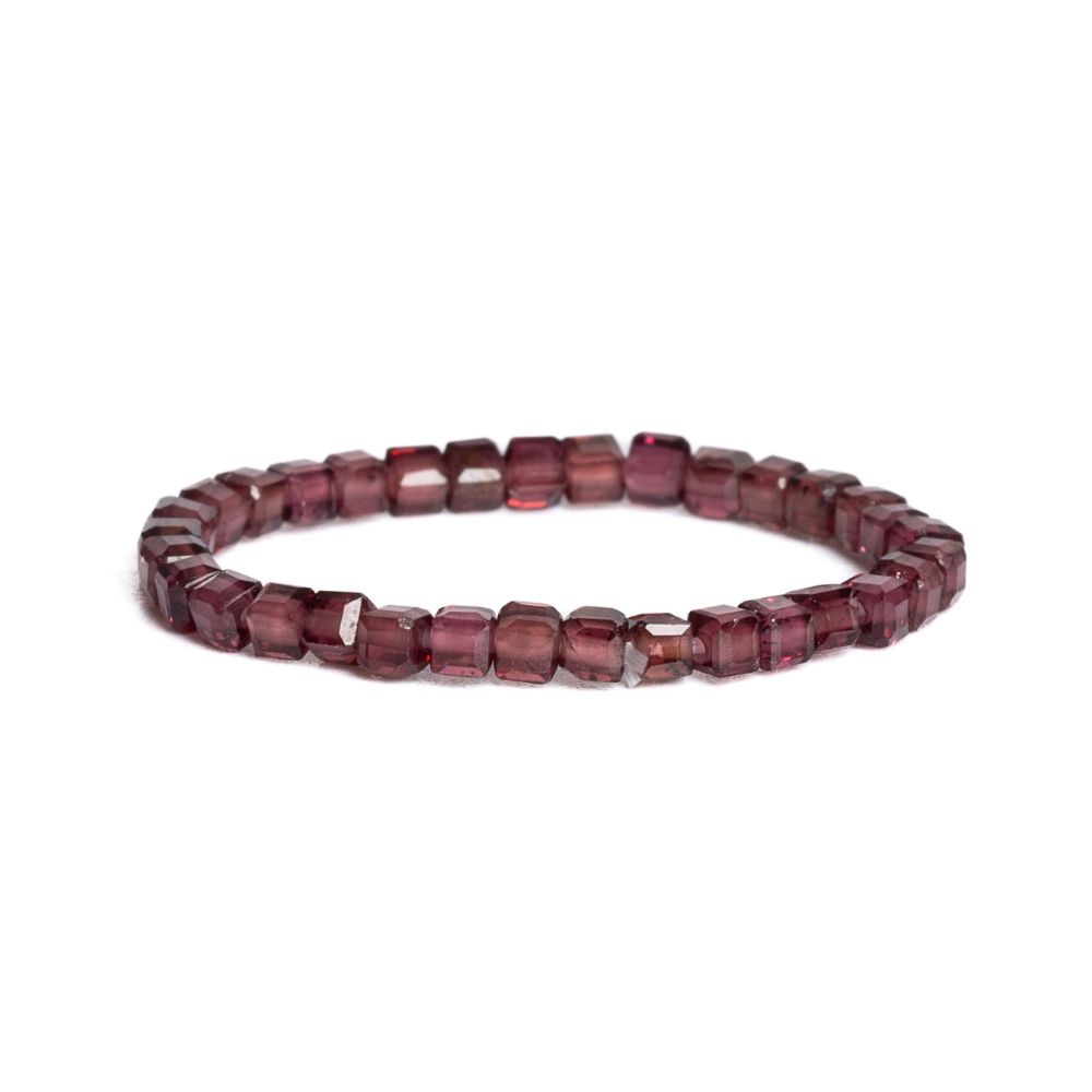 Jemný prsten z přírodního minerálu granát. Korálky ve tvaru kostek jsou navlečeny na gumičce, takže prstýnek je elastický.