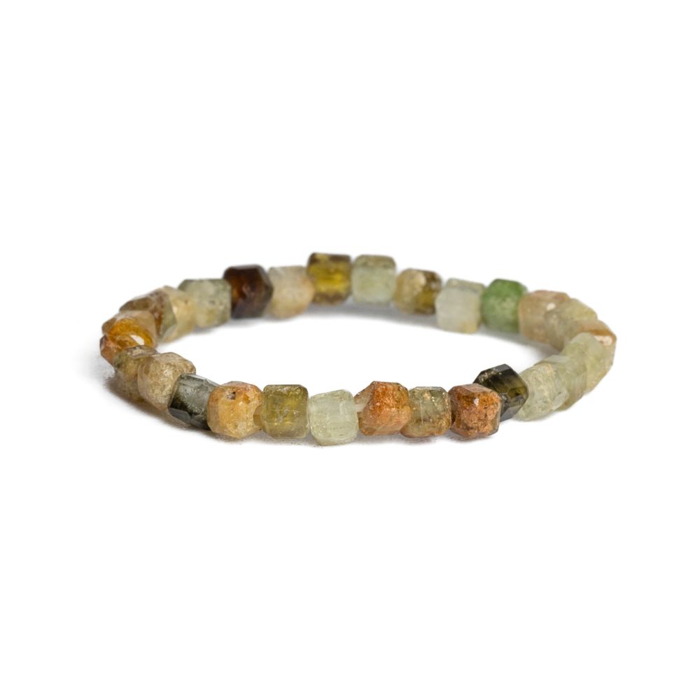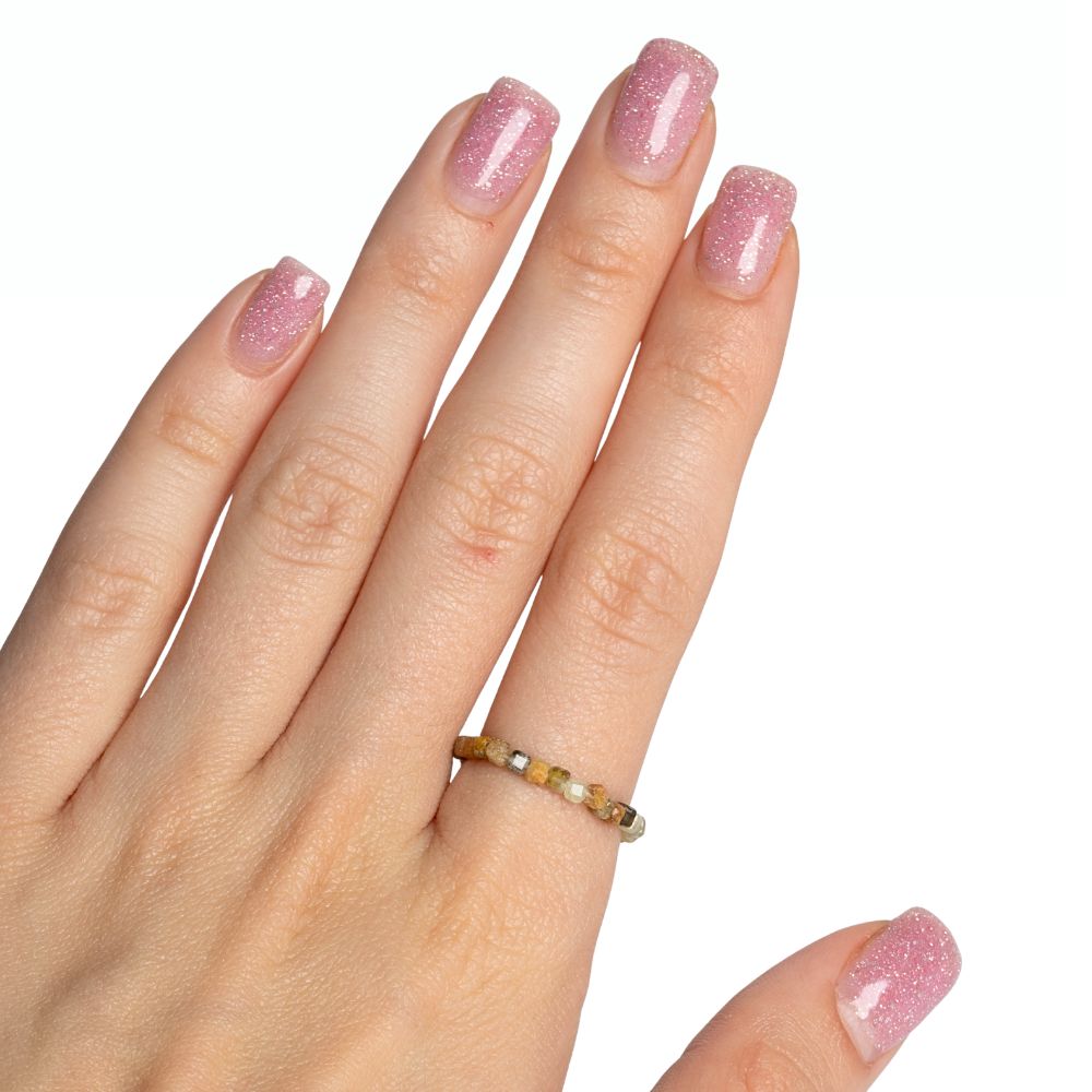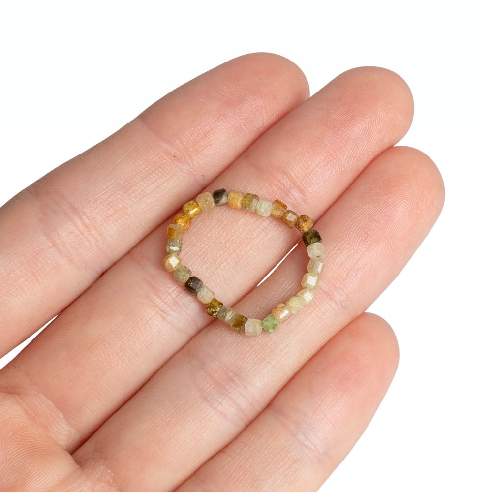 Jemný prsten z přírodního minerálu granát zelený. Korálky ve tvaru kostek jsou navlečeny na gumičce, takže prstýnek je elastický.