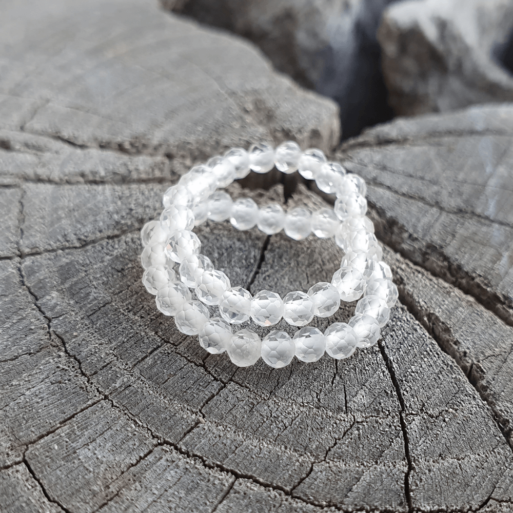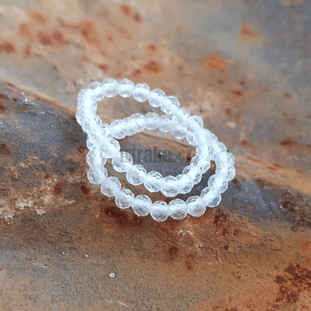 Jemný prsten z přírodního minerálu křišťál. Kulaté broušené korálky jsou navlečeny na gumičce, takže prstýnek je elastický.