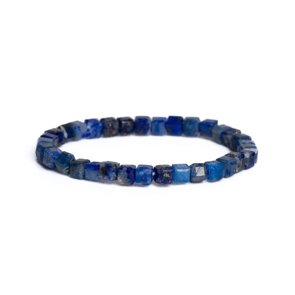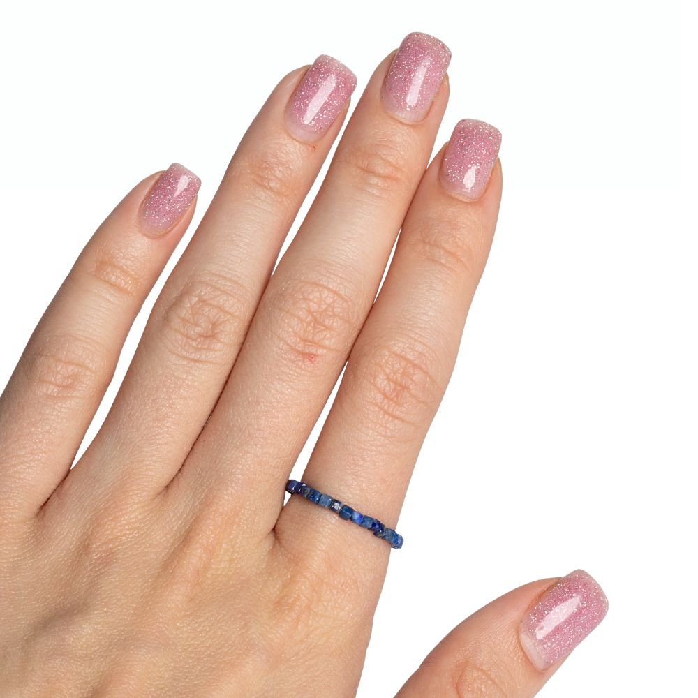 Jemný prsten z přírodního minerálu lapis lazuli. Korálky ve tvaru kostek jsou navlečeny na gumičce, takže prstýnek je elastický.