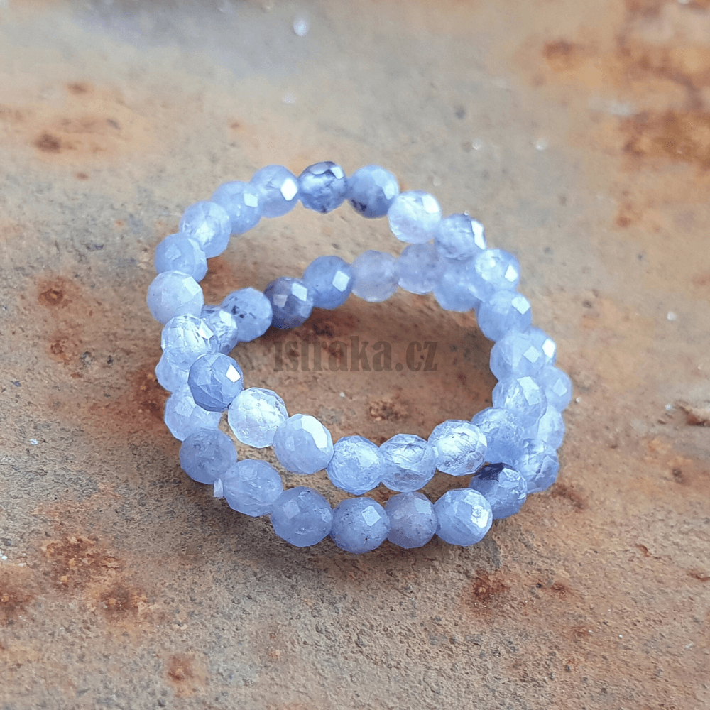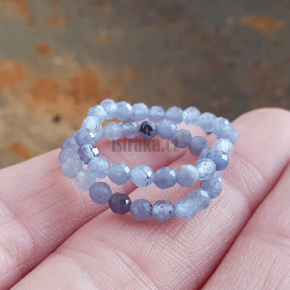 Jemný prsten z přírodního minerálu tanzanit. Kulaté broušené korálky jsou navlečeny na gumičce, takže prstýnek je elastický.