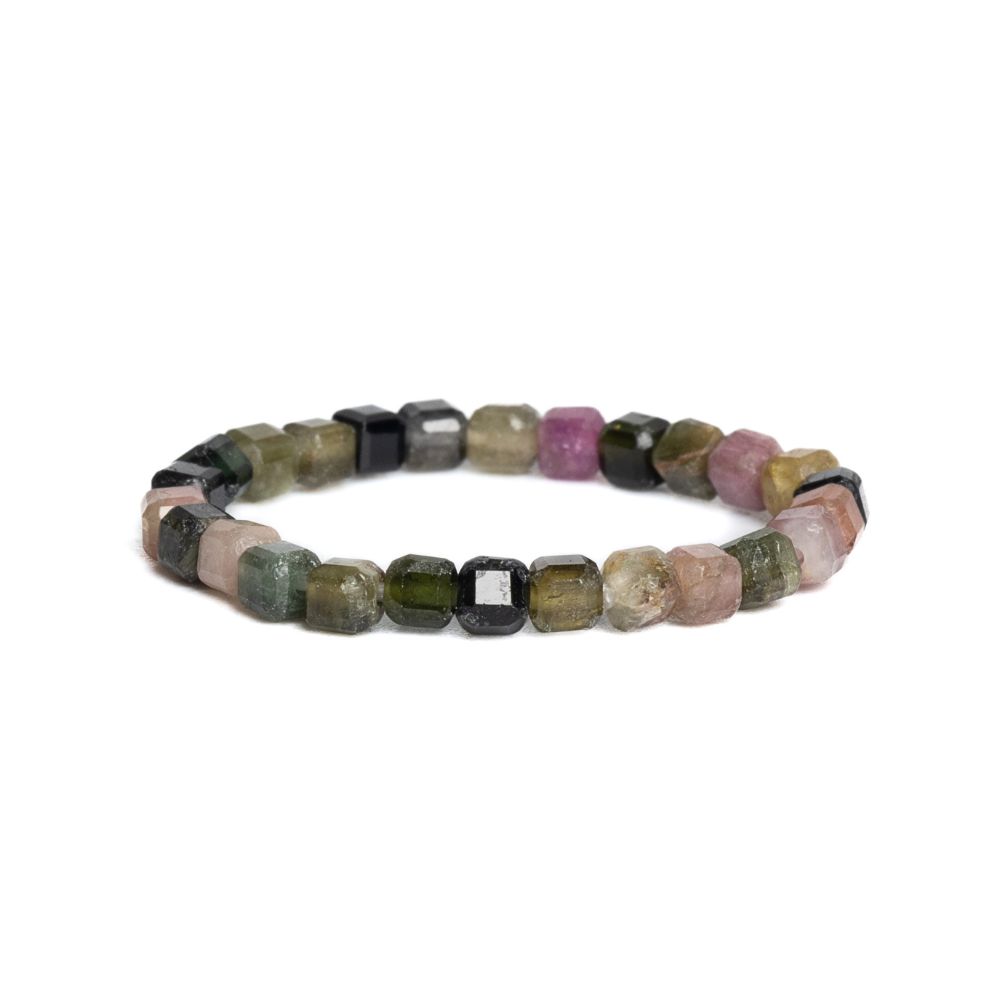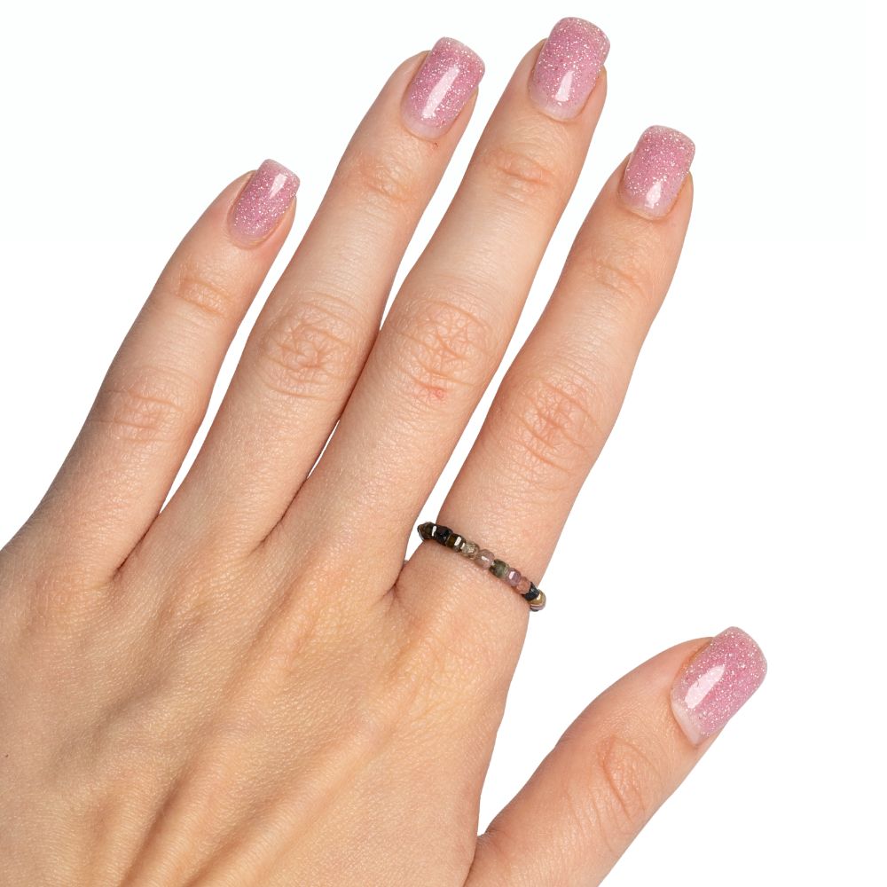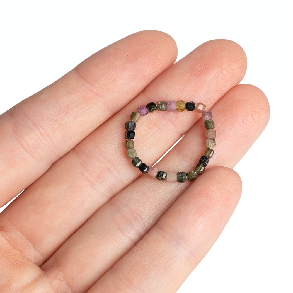 Jemný prsten z přírodního minerálu turmalín (mix barev) . Korálky ve tvaru kostek jsou navlečeny na gumičce, takže prstýnek je elastický.