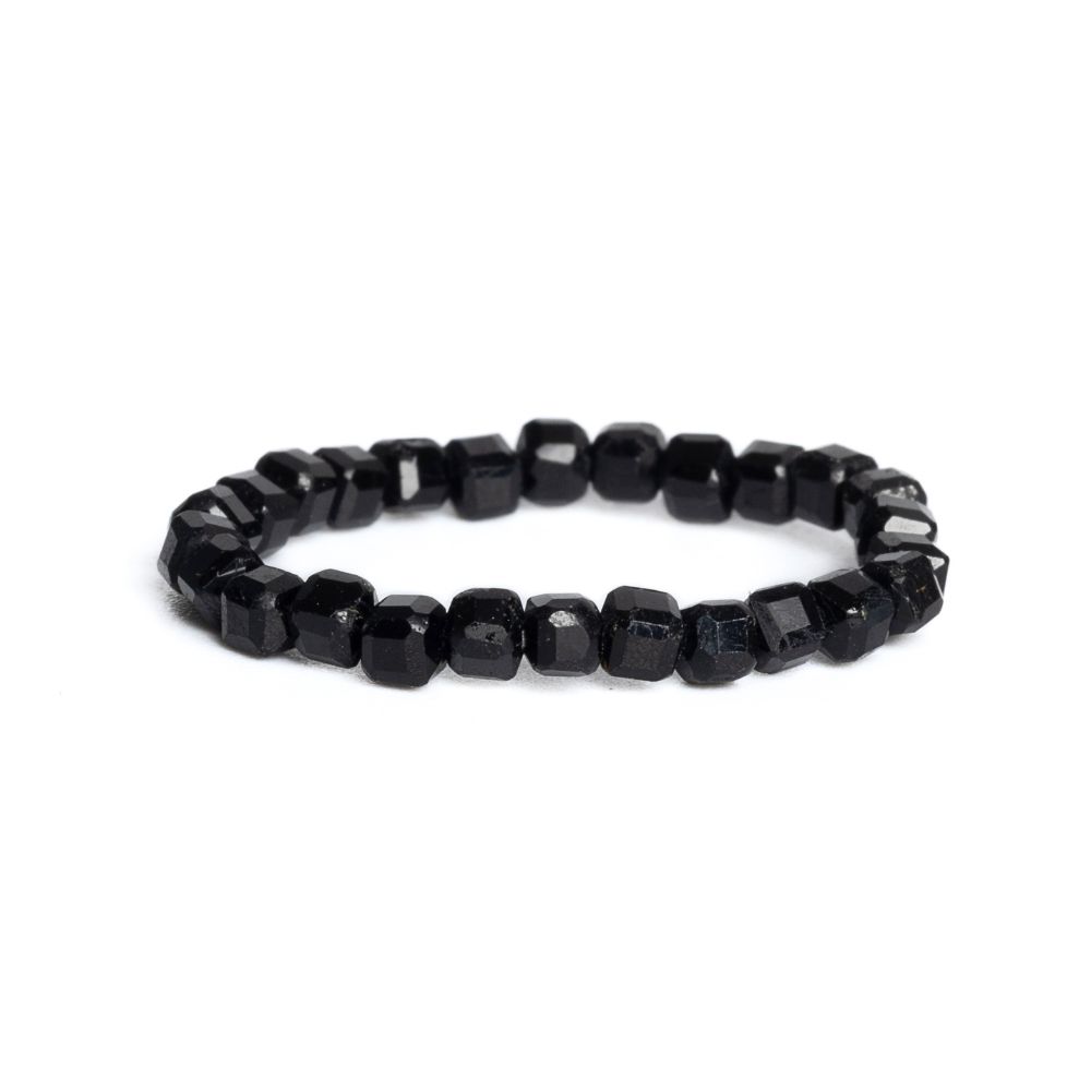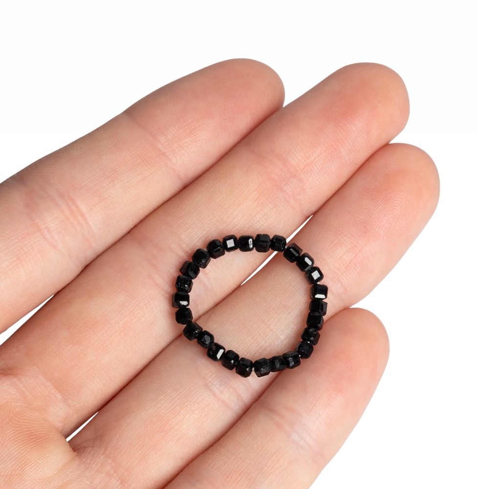 Jemný prsten z přírodního minerálu černý turmalín. Korálky ve tvaru kostek jsou navlečeny na gumičce, takže prstýnek je elastický.