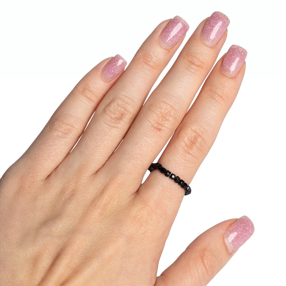 Jemný prsten z přírodního minerálu křišťál s turmalínem. Korálky ve tvaru kostek jsou navlečeny na gumičce, takže prstýnek je elastický.