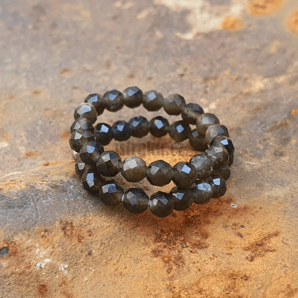 Jemný prsten z přírodního minerálu záhněda. Kulaté broušené korálky jsou navlečeny na gumičce, takže prstýnek je elastický.