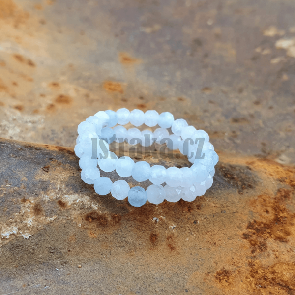 Jemný prsten z přírodního minerálu akvamarín. Kulaté broušené korálky jsou navlečeny na gumičce, takže prstýnek je elastický.