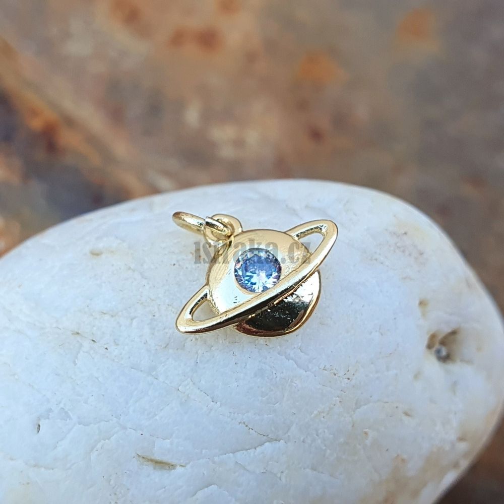 Přívěsek znázorňující planetu Saturn ve zlaté barvě s bílým kubickým zirkonem.