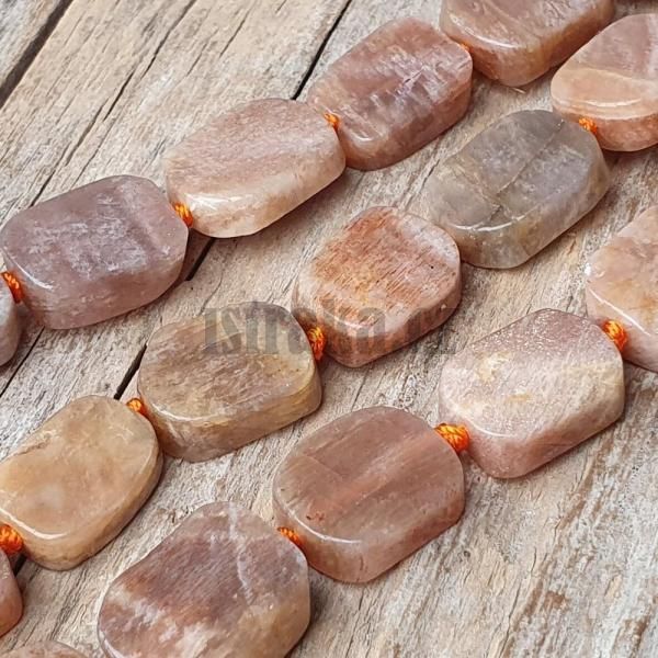 Lesklé oblé válečky ze slunečního kamene v jemných odstínech broskvové a lososové barvy.