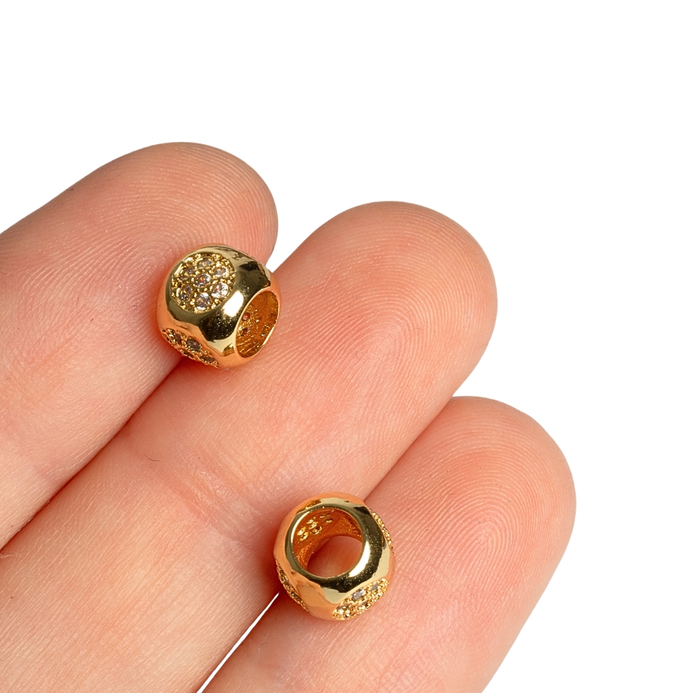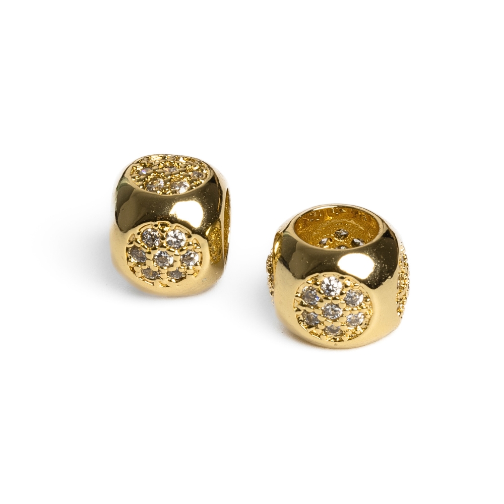 Zlatý velkodírový korálek ve tvaru soudku precizně povykládán kubickými zirkony.