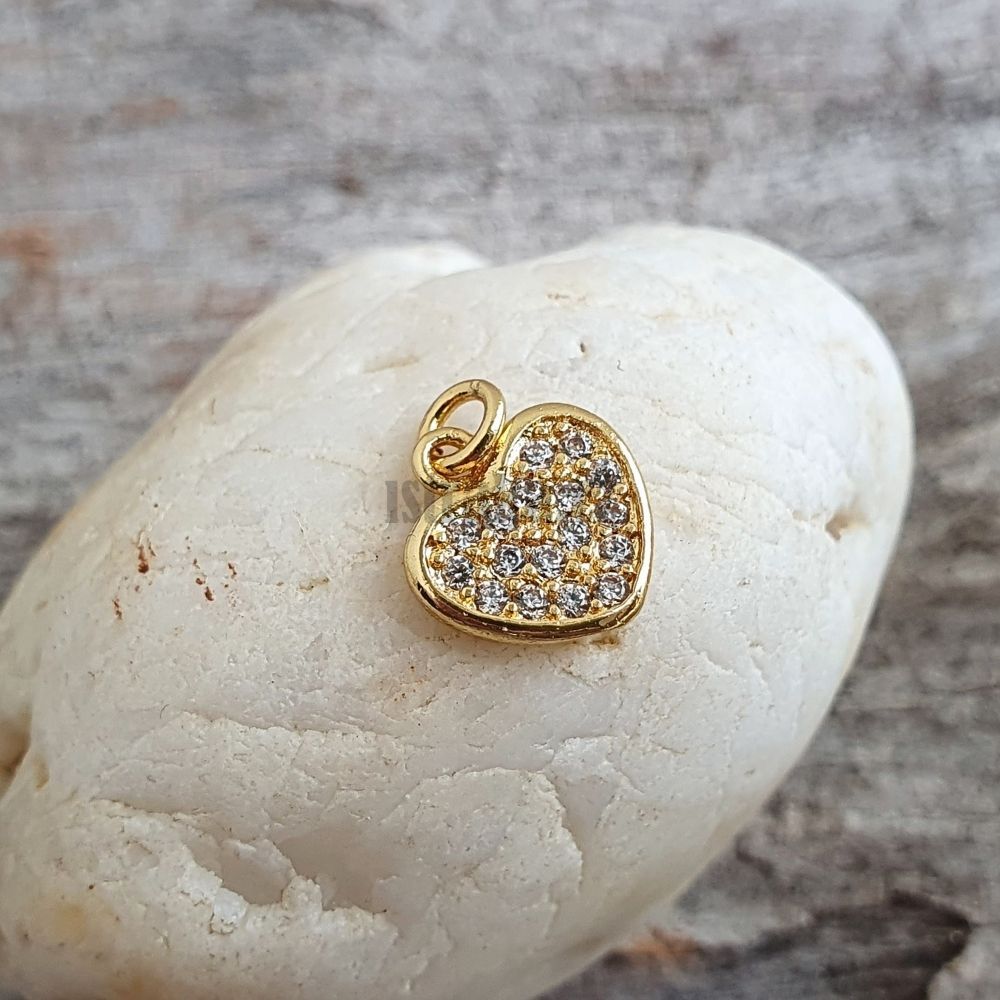Třpytivý přívěsek zlaté barvy s bílými zirkony ve formě plochého srdíčka - fantastický na doplnění náramků :)